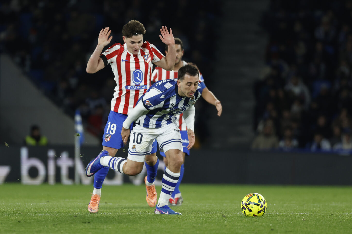 Lo cierto es que los donostiarras evocaron a aquella Real asfixiante de los primeros años con Imanol Alguacil. Kubo volvió a ser un puñal por la izquierda y Oyarzabal mantuvo el nivel de esta temporada, que está siendo estratosférico. Faltaban muchos nombres, pero estaba aquella energía alentada por un Reale Arena que vio mejores entradas otros años. Los rojiblancos, en cambio, no entraron al duelo como le gusta al Cholo pese a que en los inicios Julián perdonó una volea sólo en el área tras un córner. Una que no suele perdonar el argentino.