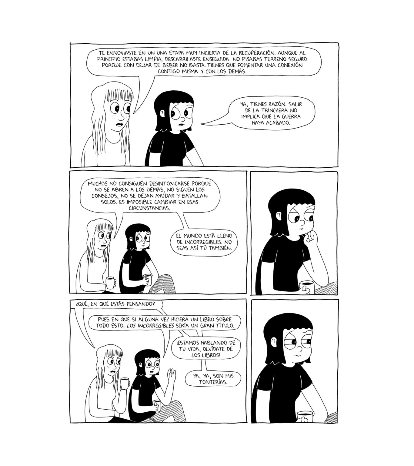 El paso del tiempo es fundamental en un proceso de rehabilitación. En Los incorregibles, Wertz detalla de manera minuciosa sus períodos de abstinencia y recaídas, casi resulta un diario: «Suelo apuntar muchas cosas, dibujar bocetos y tengo buena memoria. Pero el proceso de Los incorregibles fue muy doloroso porque me puse a dibujar y, cuando ya tenía alrededor de 100 páginas, me di cuenta de que no funcionaba. No sabía dónde iba la historia, el editor tampoco lo tenía claro, todo era muy repetitivo, pero es que estaba inmersa en la rehabilitación y aquello era lo que me salía», rememora. «No es trabajo estéril porque luego aprovechas cosas, efectivamente fue mi diario, pero de aquellas páginas se habrán salvado unas cinco para la configuración final de la obra. El libro terminó muchos años después de lo que había empezado».