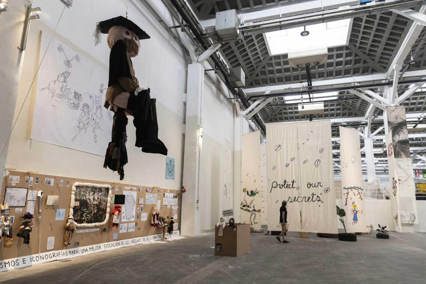 Lo cierto es que algunas obras, cuanto menos, desconciertan. Como la instalación de Efrén Álvarez titulada Manierismos e iconografías para una correcta asimilación de los hechos de la sociedad del hombre blanco. ¿Ese muñeco gigante colgando del techo se supone que es un caganer que alude a la participación catalana en la colonización de Canarias? Eso dice la cartela-manual de instrucciones. En un mural con la leyenda El universo visto desde Vic el artista ironiza sobre tradiciones como el pa amb tomaquet y versiona La nave de la Iglesia, una batalla naval con un estilo que es puro Bosco, con este epígrafe debajo Fray Manolo Kabezabolo. No es broma.