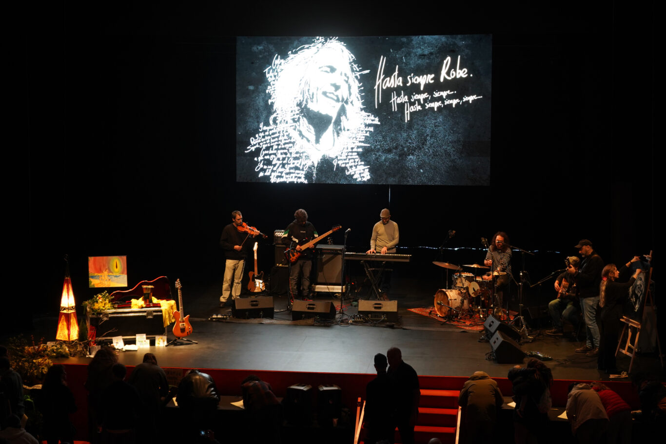 Hay lágrimas, pero al mismo tiempo felicidad al escuchar las canciones que sobre el escenario, junto a dos grandes imágenes del ídolo, toca su última banda, los que le acompañaron hasta el final: David Lemán, Álvaro Barroso, Lorenzo González, Carlitos Pérez, Alber Fuentes y Woddy Amores. «Son mi familia», dijo Rober de ellos en los últimos años, en sus últimas giras. Hoy se han subido para darle el último homenaje, como toda Extremadura, como toda España, como todo el mundo.