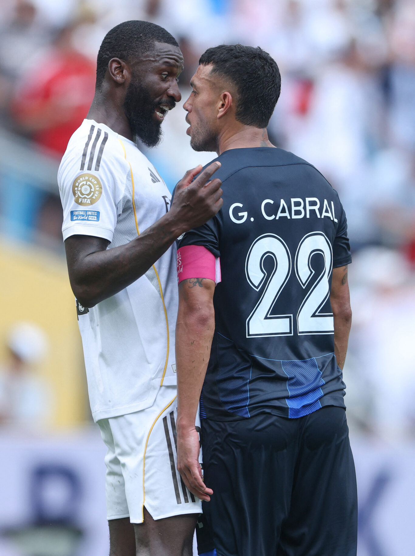 Argentino y alemán se encararon tras su choque y el árbitro, el brasileño Ramón Abatti, detuvo el partido durante unos segundos mientras se revisaba la acción tras recibir el aviso de Rüdiger por supuestos insultos racistas. El colegiado dio continuidad al juego y cuando anunció el final los dos jugadores se buscaron mutuamente, con el alemán bastante enfadado. Según fuentes del vestuario madridista consultadas por este periódico, Rüdiger asegura que Cabral le llamó «negro de mierda«.